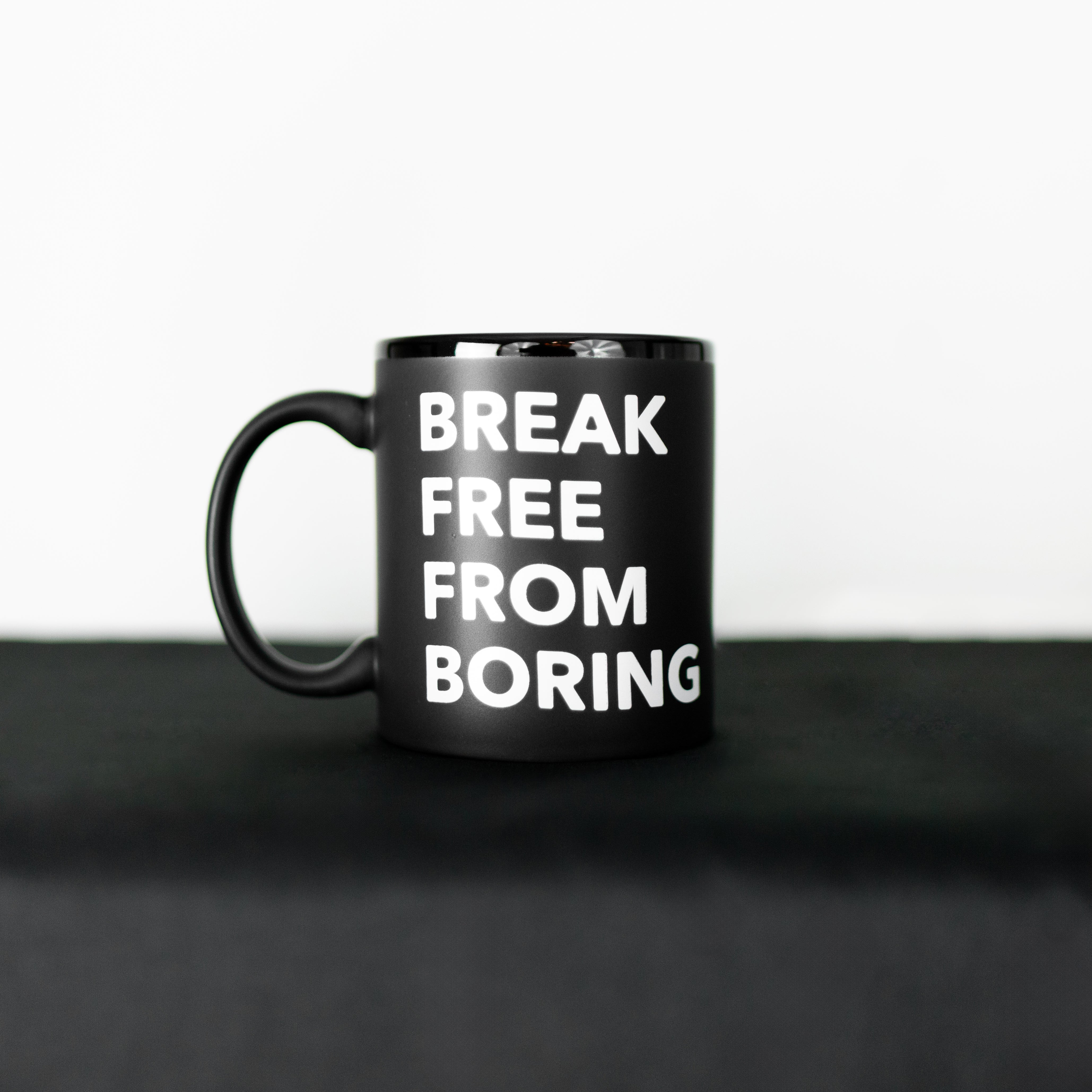 We have a MUG! Perfect for drinking our coffee or buying for your friend when you don't really know what to get them, but this is like "in your price range" since you're not really that close. Front has our logo, back has "Break Free From Boring" on it!